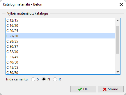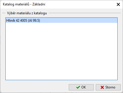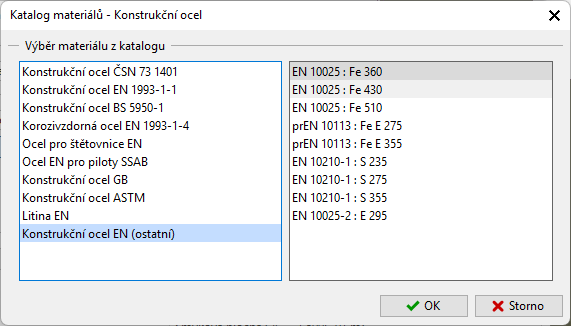 Program obsahuje katalog materiálů pro ocel a beton a jiné materiály (hliník). V dialogovém okně se zadává pouze typ materiálu. Typ průřezu se zadává v dialogovém okně "Dopočet průřezových charakteristik", nebo  "Zadání průřezových charakteristik".