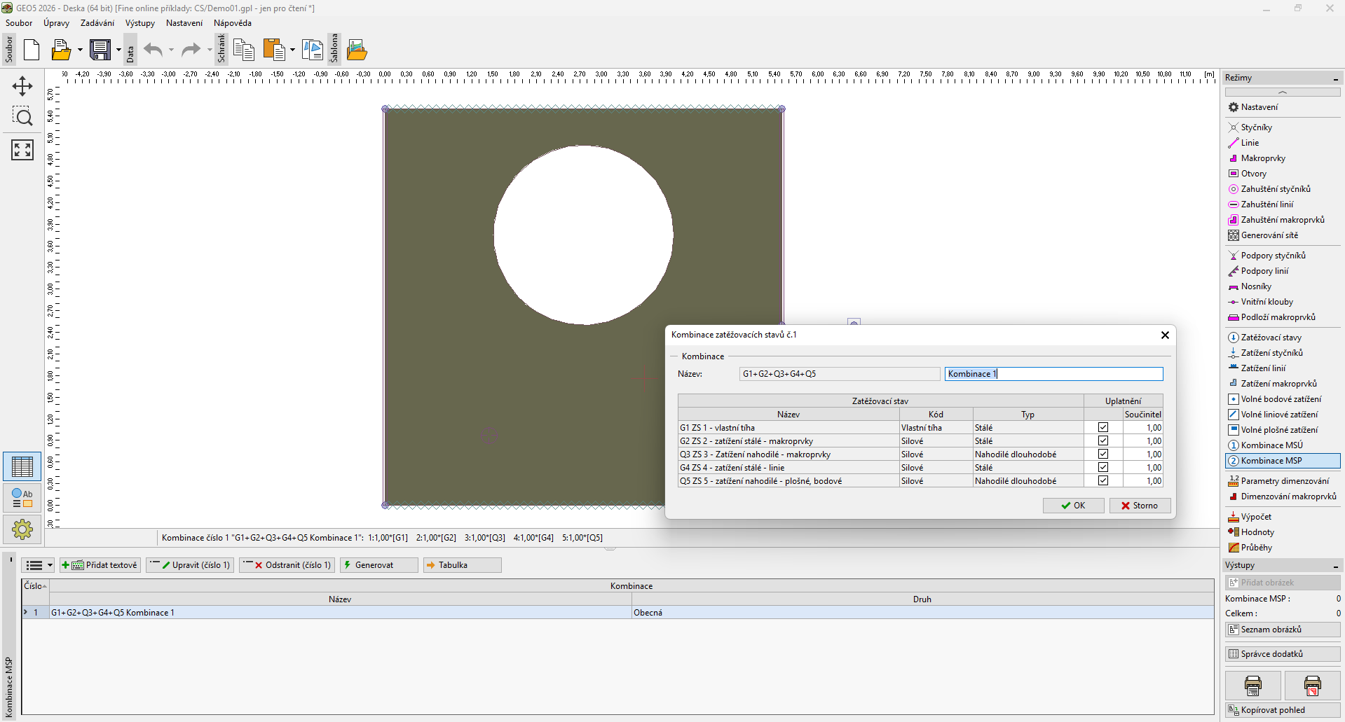 Rám "Kombinace MSP" obsahuje tabulku se seznamem zadaných kombinací mezního stavu použitelnosti. Přidání (editace) kombinace a jejich parametrů se provádí v dialogovém okně "Nová  kombinace zatěžovacích stavů". Editaci lze provádět pomocí tlačítka "Upravit", nebo kliknutím levého tlačítka myši na řádek v tabulce s požadovanou kombinací.