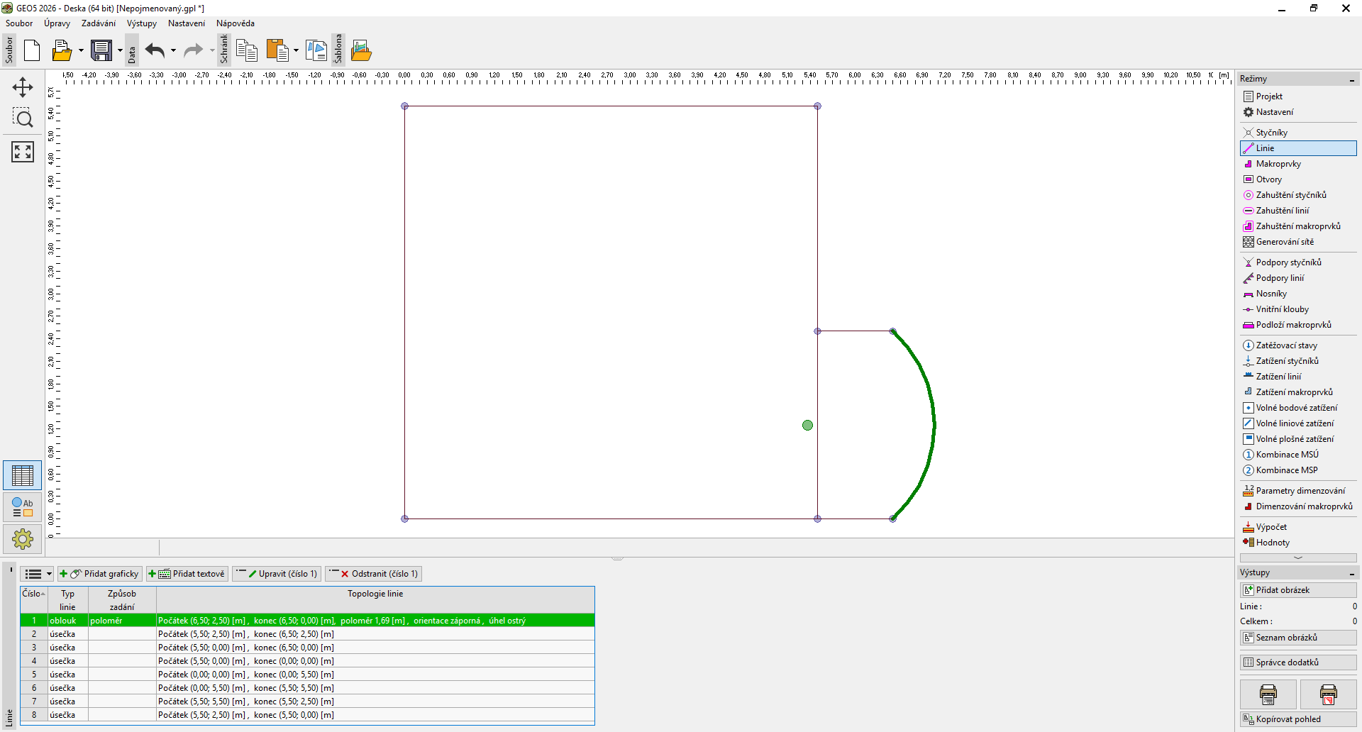 Linie jsou definovány mezi jednotlivými body (úsečky, oblouky, kružnice) resp. kolem jednotlivých bodů (kružnice). Linie se mohou libovolně dotýkat resp. protínat - průsečíky zadaných linií najde program automaticky při korekci zadané geometrie.