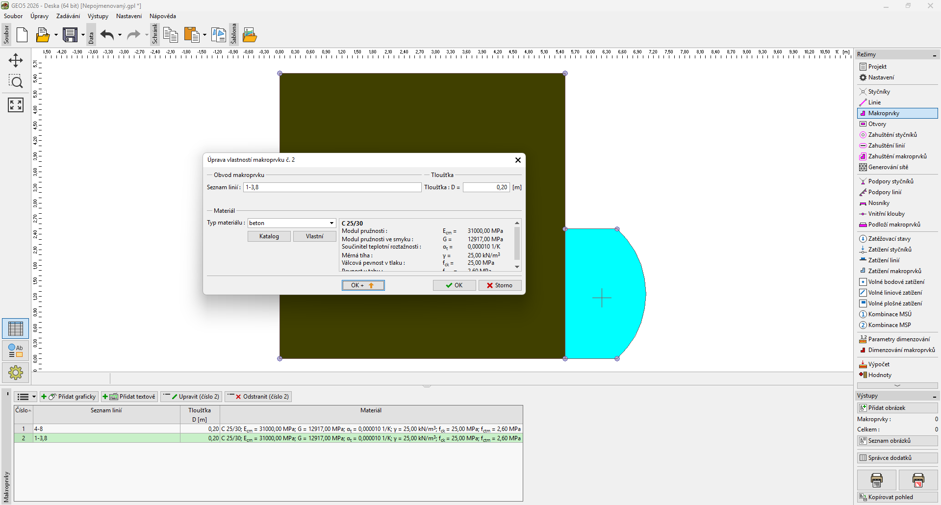 Rám "Makroprvky" obsahuje tabulku se seznamem zadaných makroprvků. Přidání makroprvků se provádí v dialogovém okně "Nové makroprvky". V dialogovém okně se zadává seznam linií, který definuje ohraničení makroprvku, tloušťka a materiál makroprvku. Materiál makroprvku lze volit z katalogu materiálů, nebo lze zadat vlastní charakteristiky materiálu v dialogovém okně "Editor materiálu".