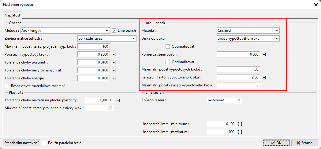 Literatura nabízí řadu formulací původní metody Arc-length. V programu je implementována metoda navrženou Crisfieldem a konzistentě linerarizovanou metodu pocházející od  Ramma. Formulace druhé jmenované metody je sice podstatně jednodušší než metoda Crisfieldova, není však zdaleka tak robustní. Standardní nastavení je metoda Crisfieldova.