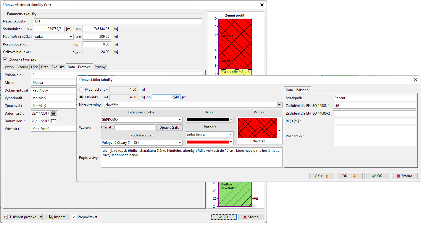 Takto definovaná uživatelská data zkoušky se pak zadávají u konkrétní zkoušky v rámu "Zkoušky" (program Stratigrafie) popř. v rámu příslušné laboratorní zkoušky (program Laboratoř).