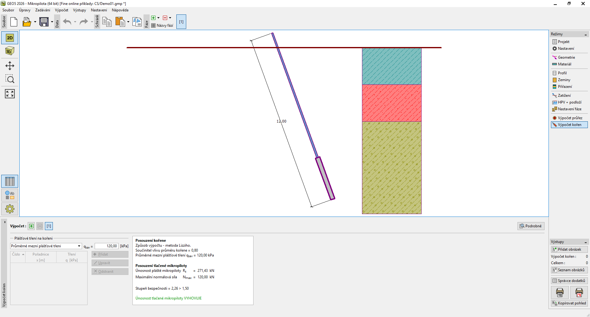V rámu "Posouzení kořene" jsou zobrazeny výsledky výpočtu. Pro jednu zadanou úlohu lze provést více výpočtů. V levé části rámu lze zadat mezní plášťové tření.