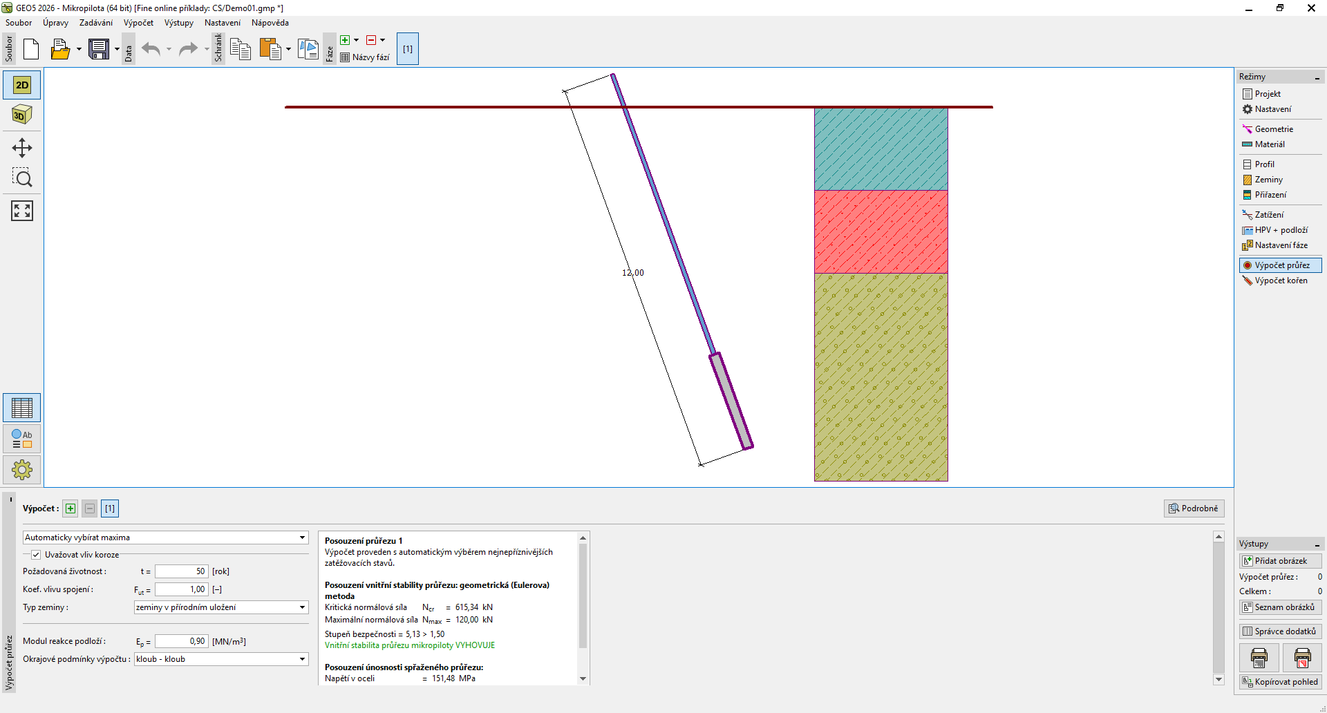 U tlačené mikropiloty se  posuzuje únosnost průřezu a vnitřní stabilita průřezu v závislosti na zvolené metodě v záložce "Mikropiloty".