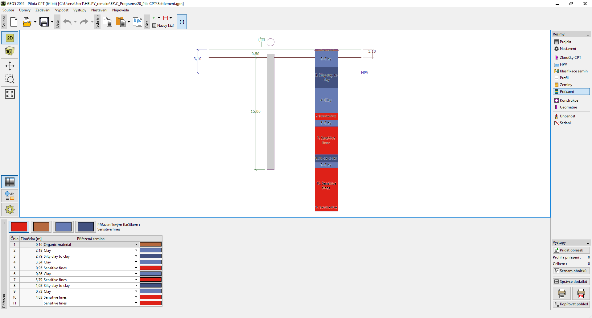 Rám "Přiřazení" obsahuje seznam vrstev profilu a k nim přiřazených zemin. Seznam zemin je graficky znázorněn pomocí tlačítek v liště nad tabulkou, nebo je přístupný z rozbalitelného seznamu u každé vrstvy profilu.