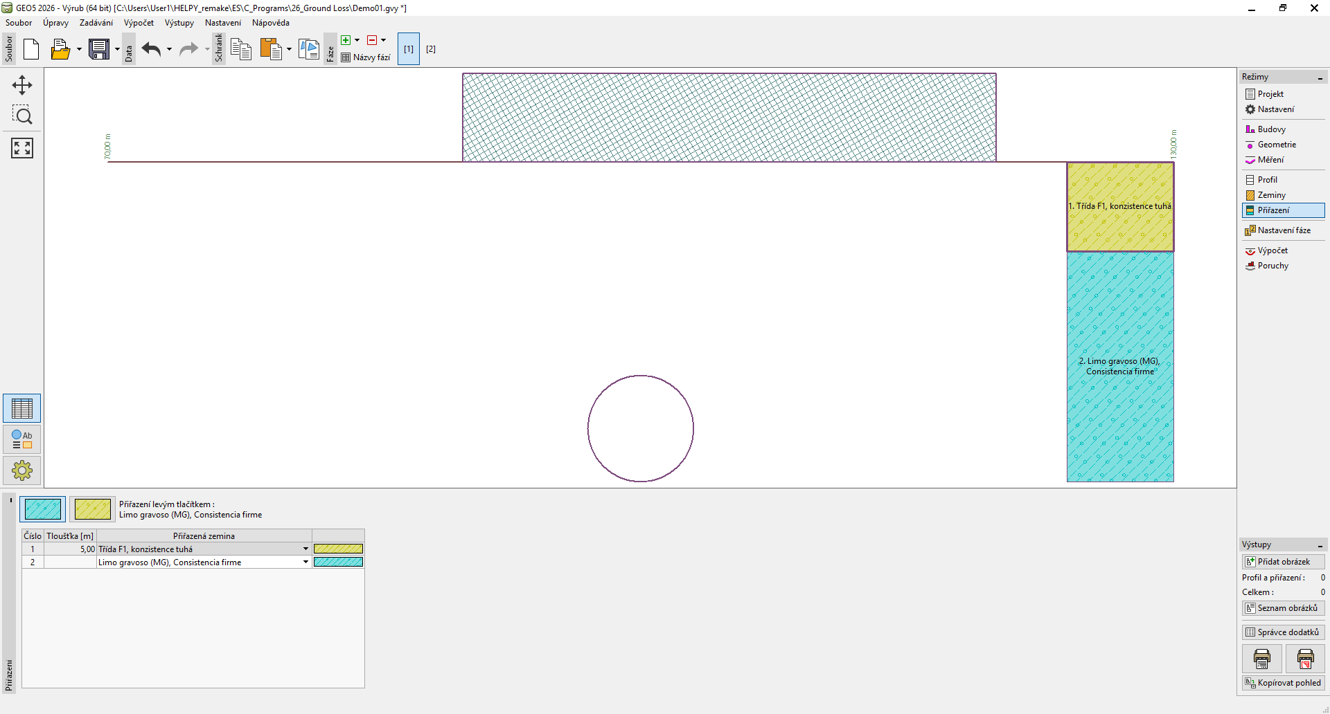 Rám "Přiřazení" obsahuje seznam vrstev profilu a k nim přiřazených zemin. Seznam zemin je graficky znázorněn pomocí tlačítek v liště nad tabulkou, nebo je přístupný z rozbalitelného seznamu u každé vrstvy profilu.