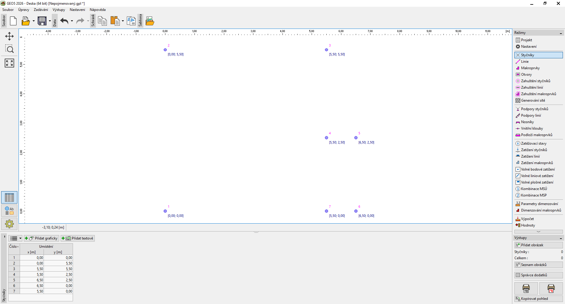 Rám "Styčníky" obsahuje tabulku se seznamem zadaných styčníků. Přidání styčníků se provádí v dialogovém okně "Nové styčníky".