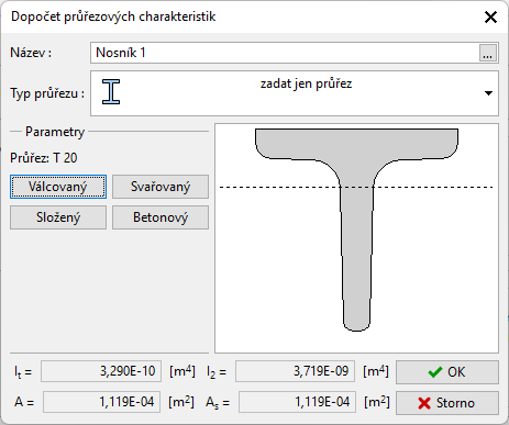 V dialogovém okně "Dopočet průřezových charakteristik" se zadávají parametry průřezu. Průřezové charakteristiky lze zadat z katalogu průřezů, nebo editoru průřezů pro různé materiály.