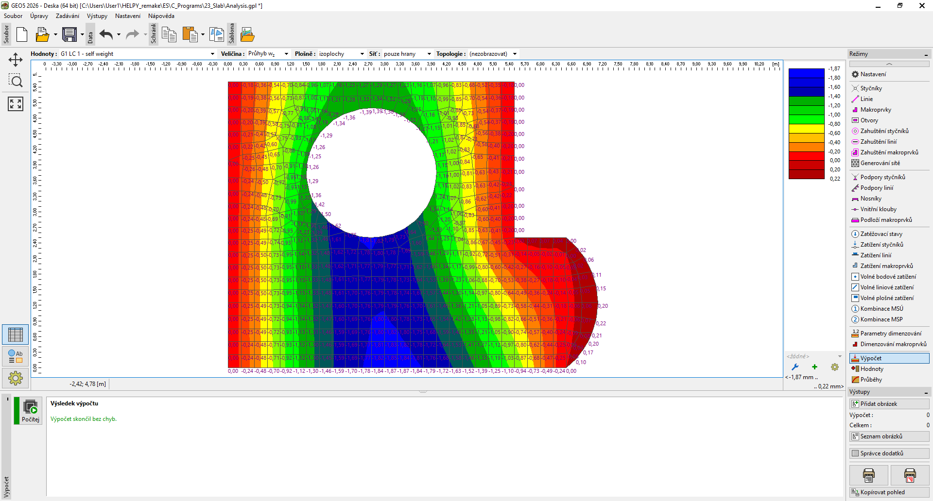 V rámu "Výpočet" jsou zobrazeny výsledky výpočtu. Výpočet je proveden pomocí metody konečných prvků. Výpočet dimenzování je proveden podle normy nastavené v záložce "Materiály a normy".