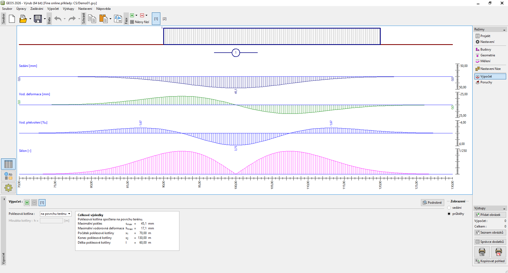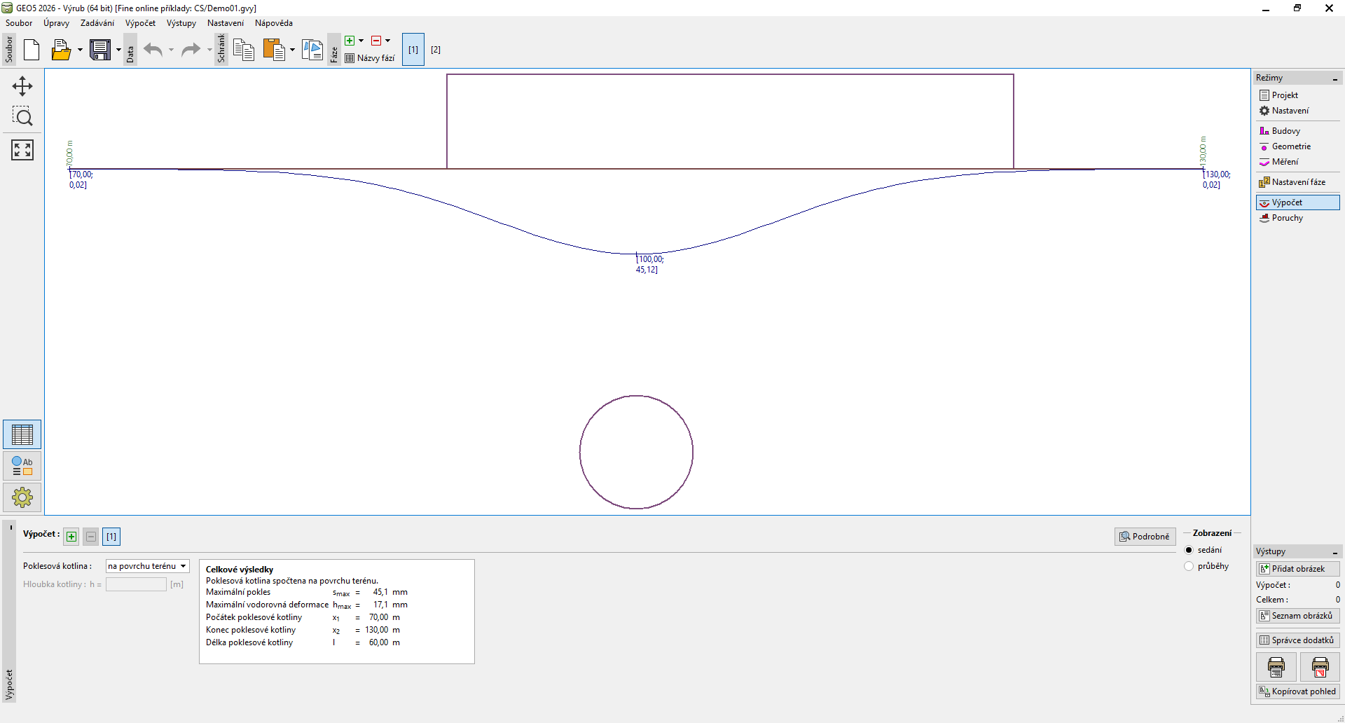 V rámu "Výpočet" jsou zobrazeny výsledky výpočtu poklesové kotliny. Pro jednu zadanou úlohu lze provést více výpočtů v různých hloubkách pod povrchem terénu. Spočtené hodnoty jsou zobrazeny na desktopu a aktualizují se okamžitě při jakékoliv změně dat a nastavení v rámu.