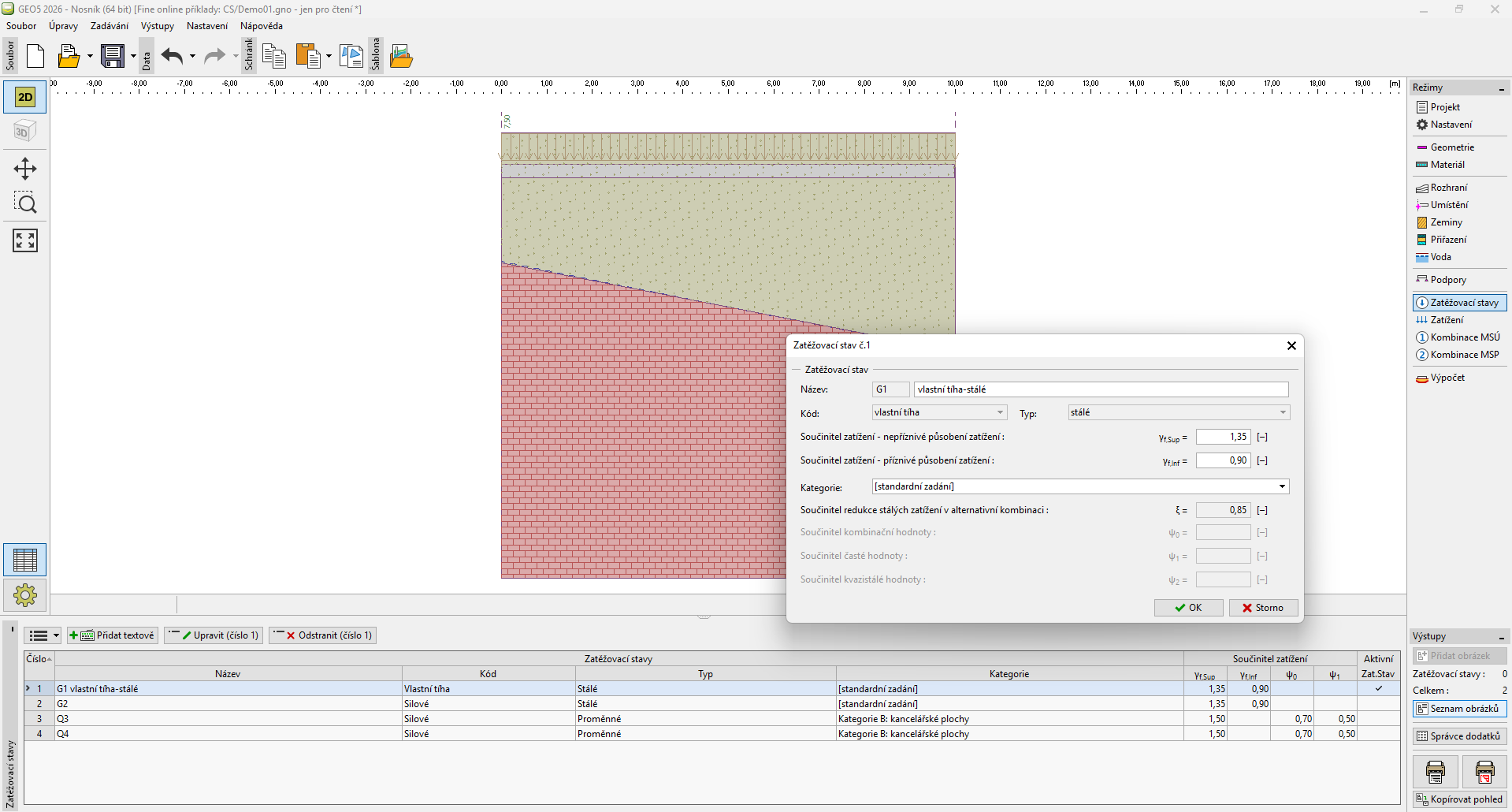 Rám "Zatěžovací stavy" obsahuje tabulku se seznamem zadaných zatěžovacích stavů. Přidání (editace) zatěžovacích stavů a jejich parametrů se provádí v dialogovém okně "Nový zatěžovací stav". Editaci lze provádět pomocí tlačítka "Upravit", nebo kliknutím levého tlačítka myši na řádek v tabulce s požadovaným zatěžovacím stavem.