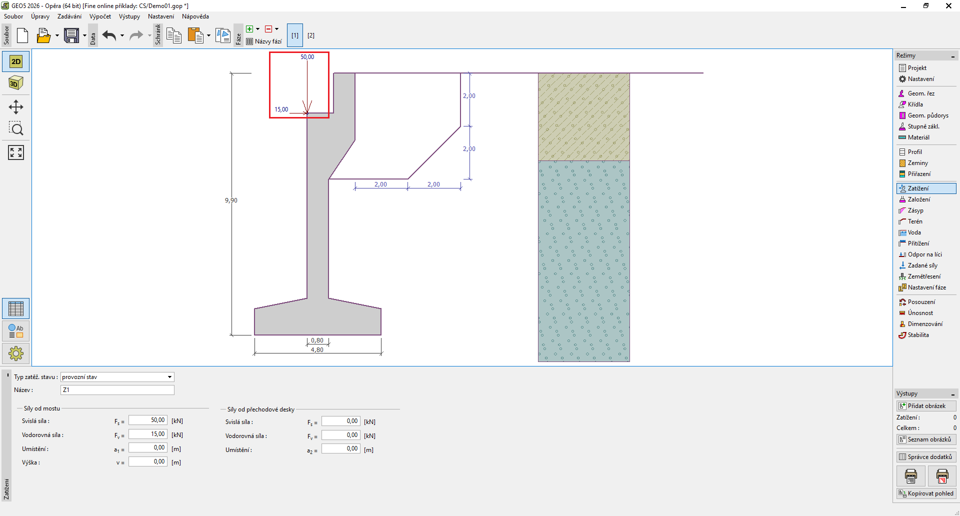 U provozního stavu se zadává zatížení od mostu a přechodové desky a jejich umístění, posuzuje se celá mostní opěra.