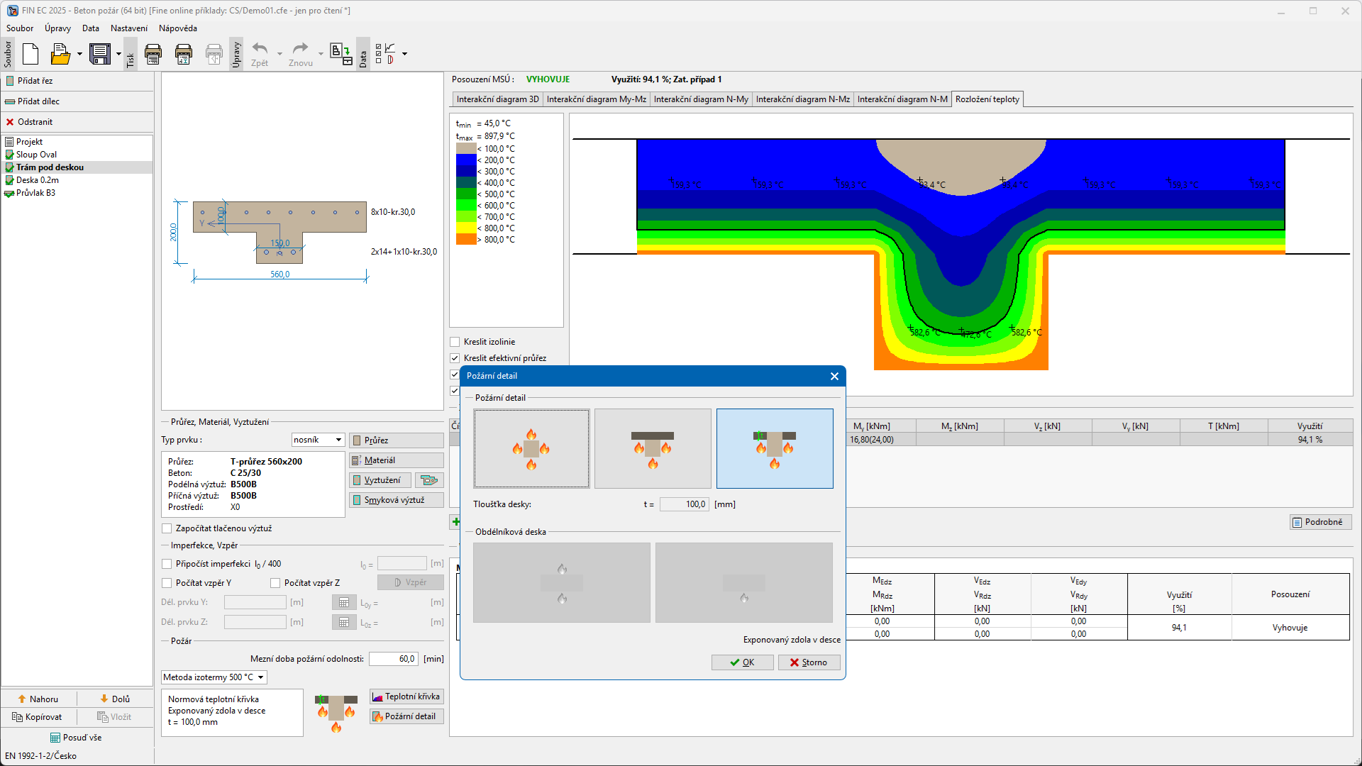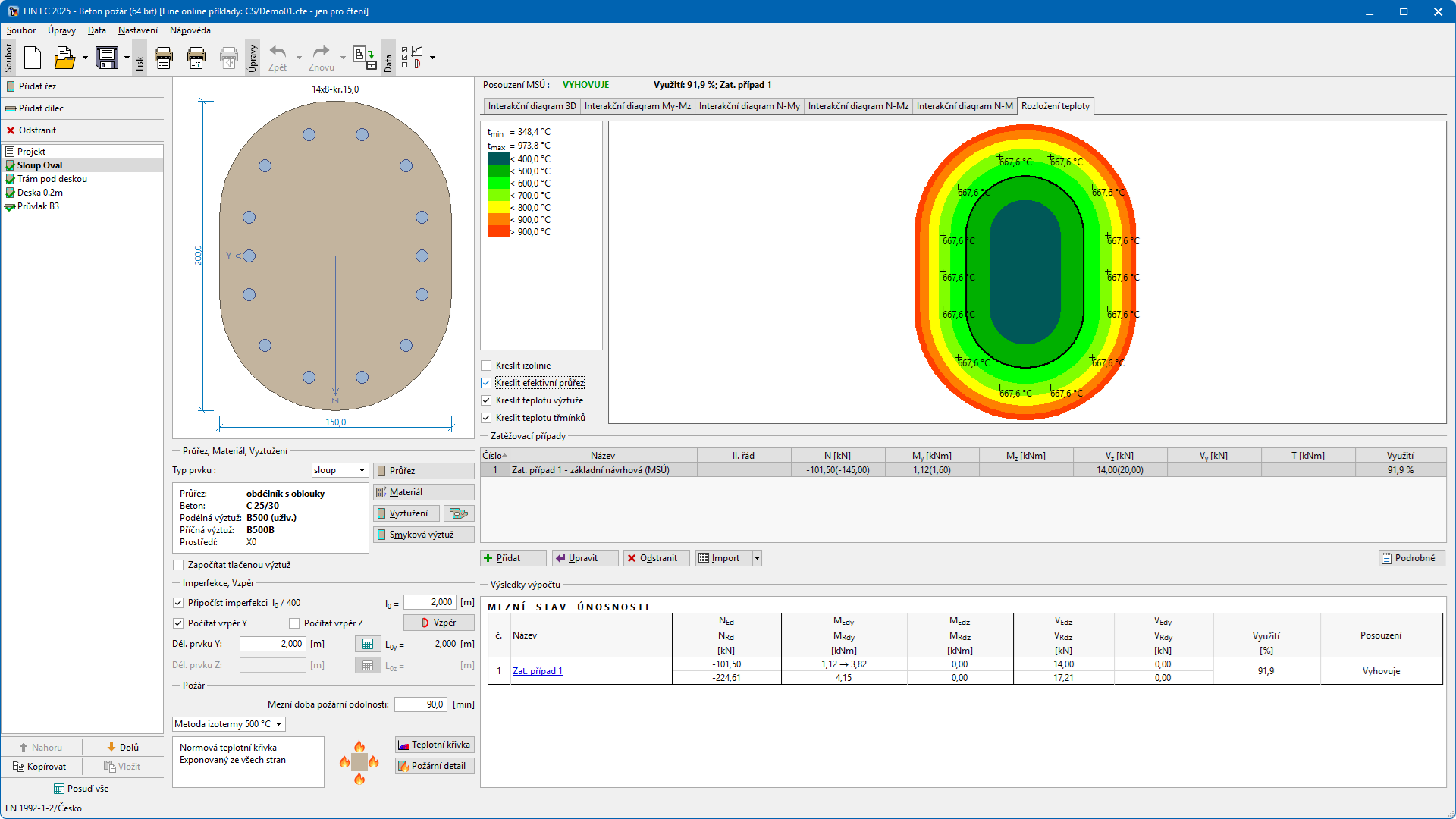 Program pro posouzení požární odolnosti železobetonových průřezů dle EN 1992-1-2 (Eurokód 2). Prvky mohou být namáhány libovolnou kombinací vnitřních sil. Při výpočtu je sestaven prostorový interakční diagram pro zadanou dobu požární odolnosti a vybraný požární detail.