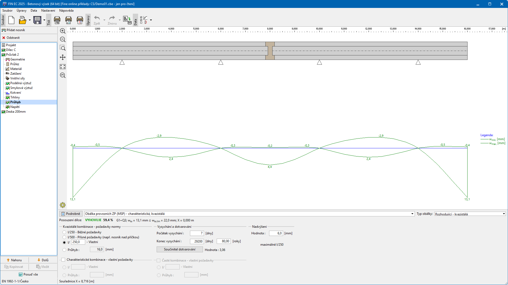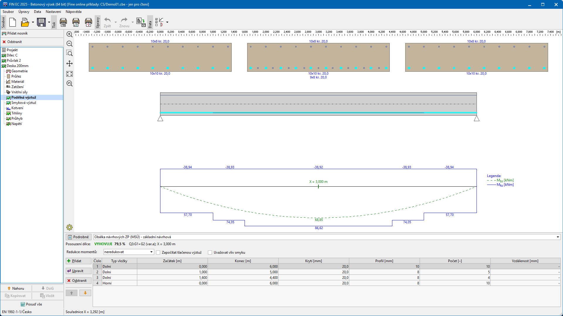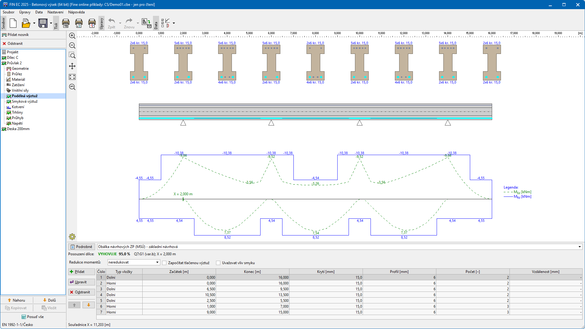 Program pro komplexní posouzení vodorovných železobetonových konstrukcí dle ČSN EN 1992-1-1 nebo ČSN EN 1992-2 (Eurokód 2). Program posuzuje spojité nosníkové prvky, resp. vodorovné části rámových konstrukcí namáhané ohybem a smykem. Posudek je prováděn jak pro mezní stavy únosnosti tak použitelnosti.