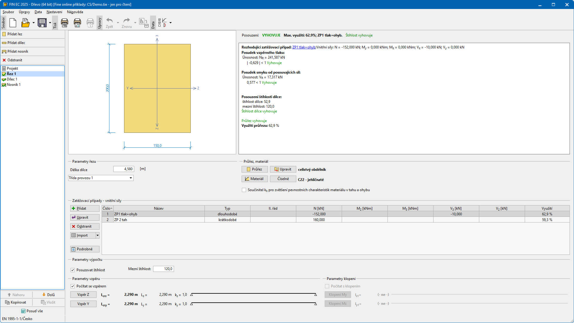 Program pro posouzení dřevěných prvků dle EN 1995-1-1 (Eurokód 5) a ČSN 73 1702. Program lze využít jako samostatnou aplikaci nebo jako dimenzační modul pro programy FIN 2D a FIN 3D.
